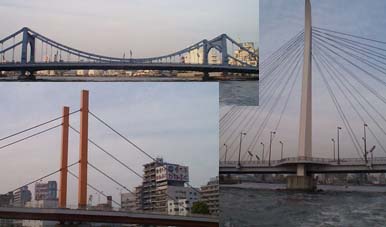 The man finally stops yelling and we walk over a small bridge into a flower-decorated park. Anne looks over the edge of the bridge and calls me over. The water is clear and the fishies are huge. Since I hate almost all Japanese food, I let Anne drag us to this tiny restaurant which is supposed to be the best Tempura place in Asakusa. I sit and watch but she looks satisfied. After lunch, we read about a boat trip which is supposed to take us from Asakusa to this man-made island. We find out that the island is closed for the day but we can take the boat trip for a loop. The boat passes under twelve bridges, each designed differently. |