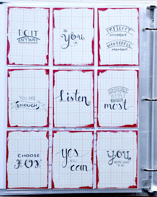 The One Little Word assignment for May was to create cards with some of the Little (and Big) Messages. Ones you’re saying, ones you’re listening to, ones that seem to keep coming up again and again. Ali also made hers cute and practiced some creative ways to write them. Since I’ve wanted to work on my lettering, I decided to try a few styles I’d been saving on Pinterest.
