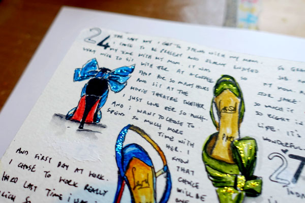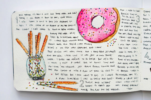 I’ve been thinking a lot about this particular project because getting a page of sketches in each week seems tough some weeks, especially since I seem to hold myself to some invisible high bar. I don’t want to give up on the plan but it’s possible I will do some collage, photos, or even blank pages this year. I really want to make sure I do the daily journaling and don’t give myself excuses to get out of that.
